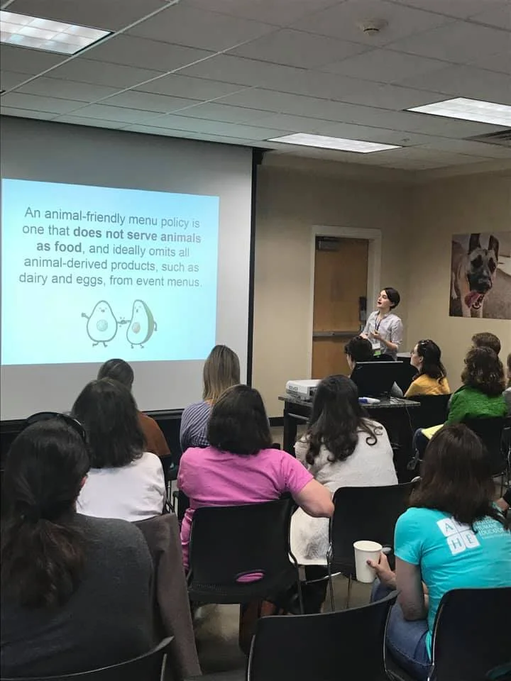 Liz also spoke on behalf of Food for Thought. Her presentation, Modeling Your Message: Increasing Your Organization’s Impact, discussed one simple change nonprofits can make to expand the scope of their impact for animals and the environment: adopting a veg-only menu policy for sponsored events and fundraisers. (You can catch a recording of it here on our Facebook page.) She heard great feedback from some of the attendees who said they were ready to go back to their organizations and make some changes! Having the opportunity to speak was wonderful, and it was a privilege to talk with such caring people about making positive changes for animals and our food systems.